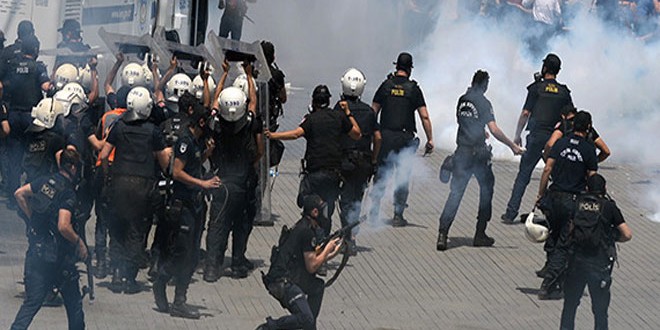 شرطة اردوغان تستخدم العنف والغاز المسيل للدموع لتفريق سكان منطقة قاضي كوي خلال توزيعهم منشورات تدعو لرفض التعديل الدستوري