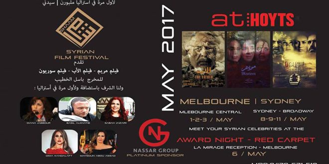 والمهرجان الذي نظمته مجموعة شام الدولية شهد عرض أفلام مريم والأب وسوريون بحضور جمع من النخب السورية والعربية في استراليا ومن بعض الوجوه الاسترالية المعروفة كما تم خلال العروض تكريم الفنانين السوريين المشاركين في الافلام وهم باسل الخطيب وصباح الجزائري وديمة قندلفت وميسون أبو أسعد والإعلامية والناقدة الفنية ديانا جبور.
