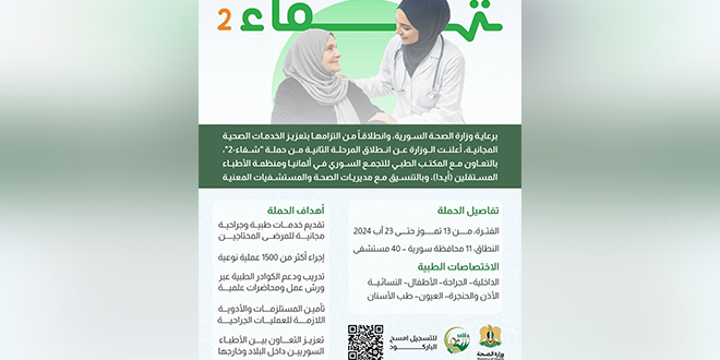 أعلنت وزارة الصحة اليوم عن انطلاق المرحلة الثانية من حملة “شفاء 2″، بالتعاون مع المكتب الطبي للتجمع السوري في ألمانيا ومنظمة الأطباء المستقلين (أيدا)، وبالتنسيق مع مديريات الصحة والمشافي المعنية في مختلف المحافظات.