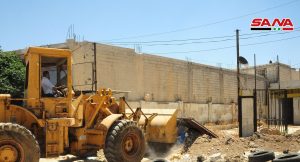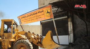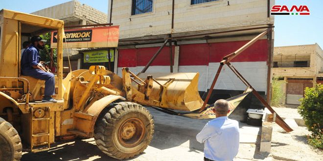 بدأت الورشات التابعة لمحافظتي دمشق وريفها حملة مكثفة اليوم لإزالة التجاوزات والتعديات المرتكبة من قبل معارض ومحلات إصلاح السيارات المخالفة في مدخل دمشق الجنوبي على أوتستراد دمشق درعا.