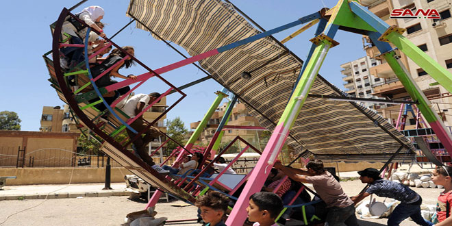للمرة الأولى بعد تحرير دمشق وريفها يحتفل أبناء العاصمة بعيد الفطر بهذا الفرح ويرسلون أولادهم للعب دون قلق أو خوف من قذيفة هاون غادرة أو رصاصة طائشة ليحيوا بذلك أجواء الفطر على اصداء انتصارات الجيش العربي السوري الذي جعل الأمن والأمان سيد الموقف في أيام العيد هذا ما أكده عدد من الأهالي الذين التقتهم كاميرا سانا في ساحات العيد بدمشق.