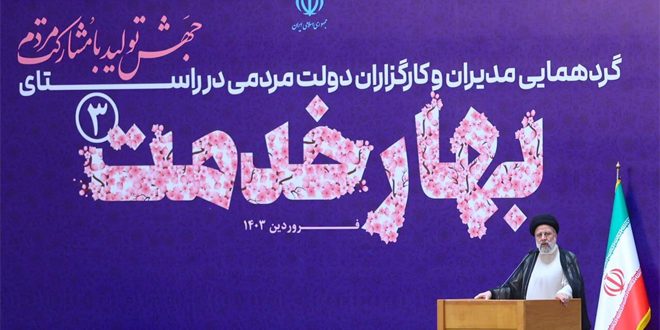 من جانب آخر، تطرق رئيسي إلى شعار العام الإيراني الجديد، مؤكداً أن شعار “القفزة الإنتاجية بمشاركة الشعب” مبني على الحاجة الملحة التي تشهدها البلاد لزيادة الإنتاج، موضحاً أن الاقتصاد يعد اليوم القضية المحورية ويجب النهوض به وتطويره، بما يحق المزيد من التقدم والازدهار للشعب الإيراني.