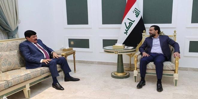 بحث رئيس مجلس النواب العراقي محمد الحلبوسي اليوم مع سفير سورية في بغداد سطام جدعان الدندح العلاقات الثنائية بين العراق وسورية وسبل تطويرها.