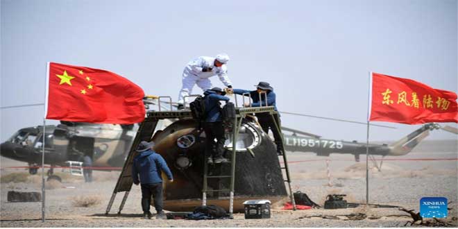 أكمل ثلاثة رواد فضاء صينيين وهم أفراد طاقم المركبة الفضائية المأهولة شنتشو13 مهمتهم التي استغرقت ستة أشهر وعادوا إلى الأرض بسلام أمس .