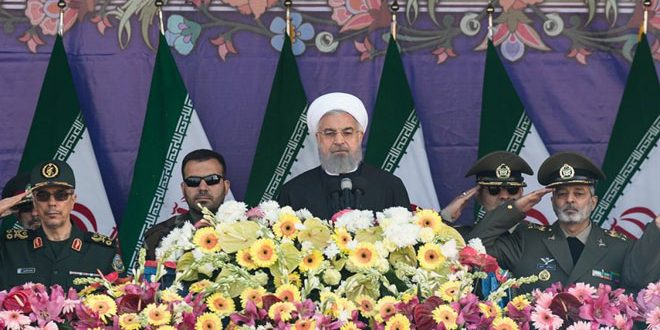 وقال روحاني خلال مراسم الاستعراض العسكري الذي أقيم صباح اليوم جنوب العاصمة طهران بمناسبة يوم الجيش الإيراني: إن “إيران بحاجة إلى جيش قوي وحرس ثوري مقتدر لكي لا تسمح للمجموعات الإرهابية بالاقتراب منها” موضحا أن الجيش الإيراني يحافظ على استقلال ووحدة البلاد ويتمتع بالجهوزية دائما في وجه مؤامرات الأعداء.