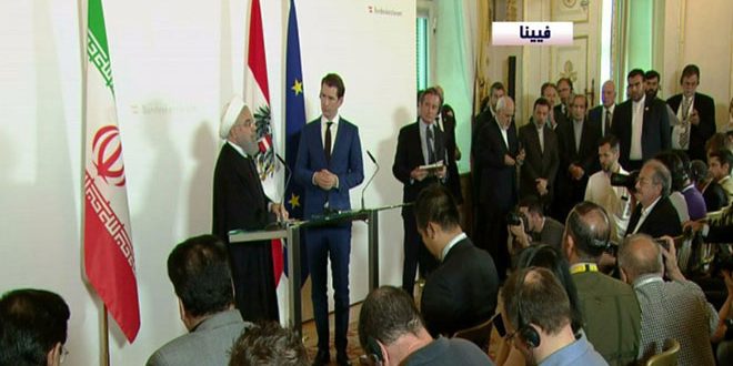 وأشار روحاني في مؤتمر صحفي مشترك مع المستشار النمساوي سيباستيان كورتز في فيينا اليوم إلى أن هدف إيران الرئيسي من التواجد في سورية كان المساعدة في مكافحة تنظيم داعش الإرهابي وباقي المجموعات الإرهابية وقد تم دحر الإرهاب بالرغم من دعم أمريكا وكيان الاحتلال الإسرائيلي له موضحا أن بلاده ستواصل وقوفها إلى جانب سورية حتى القضاء على الإرهابيين وأن مستقبل سورية يقرره الشعب السوري.