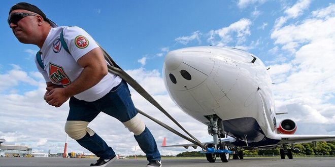 روسي يسجل رقماً قياسياً بجر طائرة تزن 16 طناً