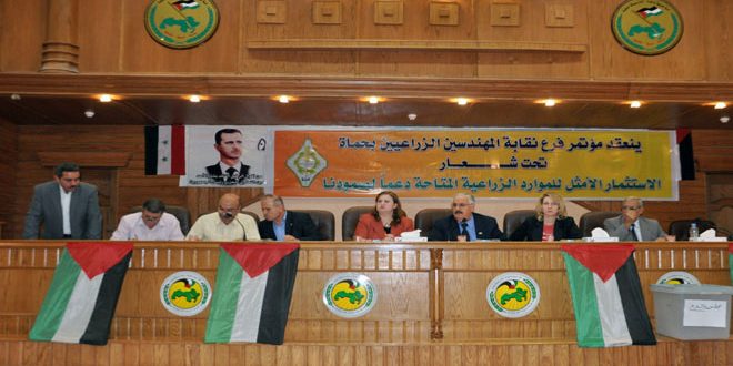 وأكد أعضاء النقابة خلال عقد مؤتمرهم الانتخابي اليوم تحت شعار “الاستثمار الأمثل للموارد الزراعية المتاحة دعما لصمودنا” ضرورة الإسراع بالحصول على إعانات التعاون الاجتماعي والوفاة وفتح حسابات لدى المصرف العقاري بحماة للمهندسين الزراعيين المحالين على التقاعد النقابي بشكل دائم.