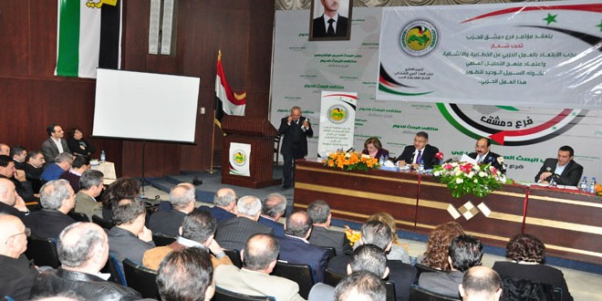تركزت مداخلات المشاركين بالمؤتمر السنوي لفرع دمشق لحزب البعث العربي الاشتراكي على ضرورة اعتماد أسس علمية واضحة متكاملة لمرحلة إعادة الإعمار والتركيز على الصناعات الوطنية الدوائية والنسيجية والتوسع في استخدام تقانة المعلومات والنظر في موضوع القرض العقاري للذين تضررت منازلهم جراء الإرهاب.