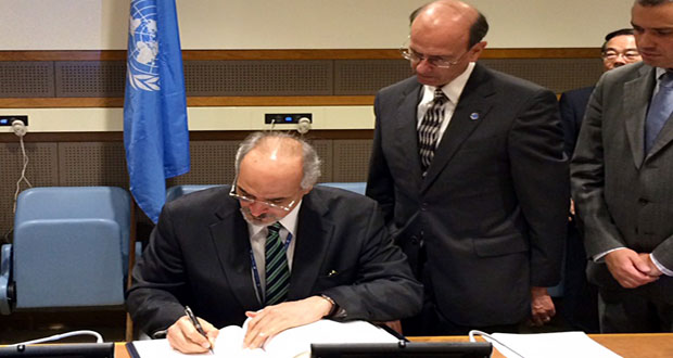 ووقع الاتفاقية في مبنى الأمم المتحدة أمس الأربعاء الدكتور بشار الجعفري مندوب سورية الدائم لدى الأمم المتحدة بالنيابة عن حكومة الجمهورية العربية السورية.
