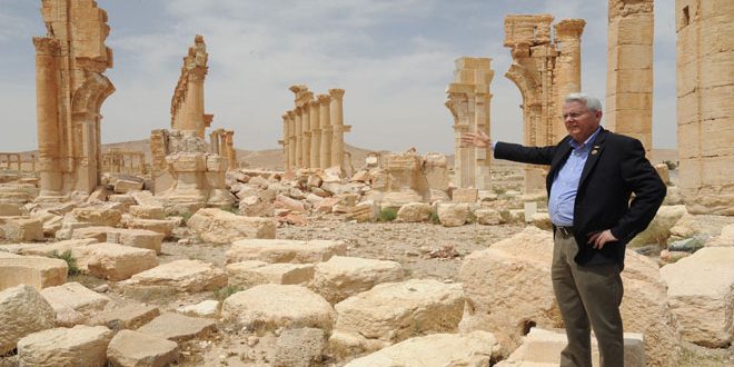 زار السيناتور الأمريكي ريتشارد بلاك اليوم مدينة تدمر الأثرية وحمص القديمة وتوقف خلال زيارته في مطار التيفور العسكري قرب تدمر حيث التقى عددا من ضباط وطياري الجيش العربي السوري معبرا عن إعجابه بما قدمه الجيش من تضحيات في مواجهة الإرهاب معتبرا أن “كل من يحمل السلاح بوجه الدولة السورية إرهابي” وقال بلاك “أدعم الرئيس بشار الأسد بشكل مطلق وأنا سعيد بالتعاون السوري الروسي لمكافحة الإرهاب”.