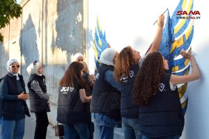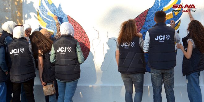مجموعة من الشباب والشابات من أعضاء الغرفة الفتية الدولية بحمص يعملون بشغف وإصرار لتنفيذ جدارية هدفها التوعية بأهمية الصحة النفسية كمفهوم تعمل عليه الغرفة ضمن توجهاتها وبرامجها.