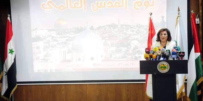 وقالت المستشارة السياسية والإعلامية في رئاسة الجمهورية رئيسة مجلس أمناء مؤسسة القدس الدولية “فرع سورية” الدكتورة بثينة شعبان في كلمة لها إن: “فلسطين ستبقى البوصلة هي والقدس روحنا وهويتنا ولا وجود للعرب دون حل هذا الصراع العربي الإسرائيلي بما يضمن كرامتهم ومستقبلهم ومستقبل أجيالهم ولا شك أن النصر قادم”.