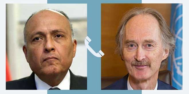 وقال المتحدث باسم الخارجية أحمد حافظ في بيان اليوم: إن شكري تلقى اتصالاً هاتفياً من المبعوث الخاص للأمين العام للأمم المتحدة إلى سورية غير بيدرسون في إطار التنسيق والتشاور الدوري حيال المستجدات على الساحة السورية.