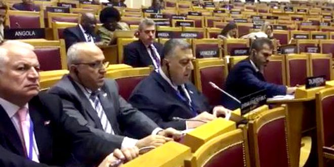 وقال صباغ في مداخلة له أمام الجمعية العامة للاتحاد البرلماني الدولي إن “مجلس الشعب في الجمهورية العربية السورية يدين ويستنكر الاعتداء على الأراضي السورية من قبل الكيان الصهيوني وذلك بإطلاقه عدة صواريخ يوم أمس الاثنين من داخل الأراضي المحتلة على مناطق آمنة في ريف دمشق”.