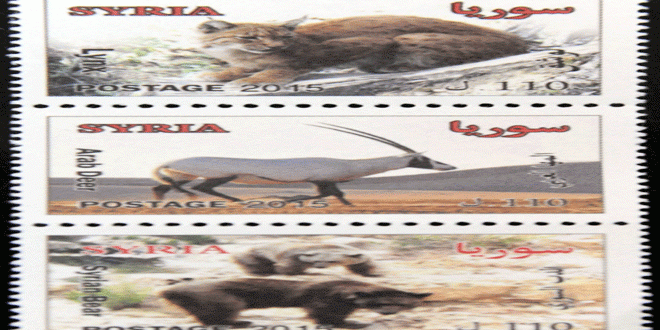 أصدرت المؤسسة العامة للبريد ثلاثة طوابع بريدية تذكارية قيمة كل منها 110 ليرات سورية تحمل صور حيوانات من البيئة السورية مهددة بالانقراض وهي الوشق والدب السوري والمها العربي.