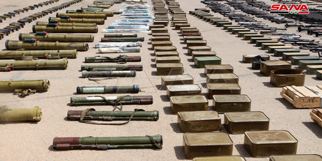 وفي إطار الجهود التي تبذلها القوات المسلحة والأجهزة الأمنية المختصة وبالتعاون مع الأهالي الشرفاء في المنطقة الجنوبية تم مؤخراً ضبط كميات كبيرة من الأسلحة والذخائر بعضها كان مخبأ ضمن المناطق التي كانت تنتشر فيها التنظيمات الإرهابية والبعض الآخر تم ضبطها خلال محاولة الخلايا تجميع بعض إرهابييها لاستهداف المناطق الآمنة ونقاط الجيش العربي السوري.