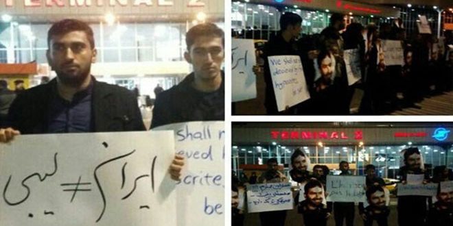 نظم طلاب جامعيون ايرانيون وقفة أمام مطار مهر آباد الدولي احتجاجا على زيارة وزير الخارجية الفرنسي جان ايف لودريان إلى طهران اليوم.