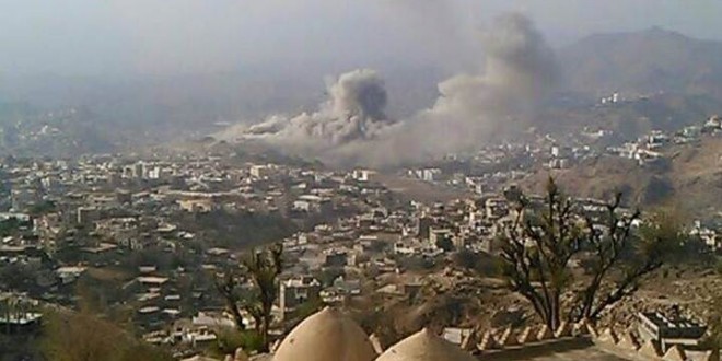 شن طيران العدوان السعودي سلسلة غارات على محافظة تعز اليمنية مستهدفا الأحياء الشمالية والشرقية للمدينة .