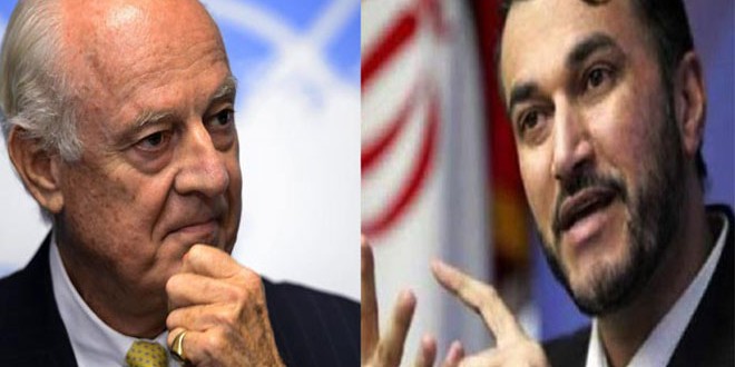 جدد مساعد وزير الخارجية الإيراني للشؤون العربية والافريقية حسين أمير عبد اللهيان دعم بلاده لجهود الأمم المتحدة في عقد الحوار السوري السوري في جنيف مؤكدا ضرورة تزامن مساري مكافحة الإرهاب والحل السياسي للأزمة في سورية وفقا لبياني فيينا ونيويورك.