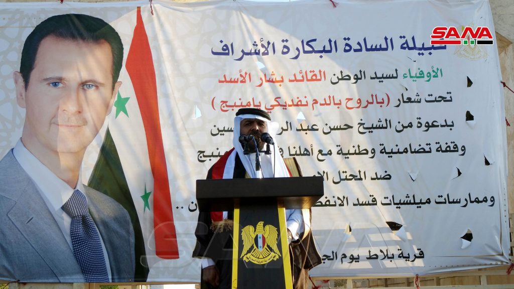 بدوره قال الشيخ علي رسلان شيخ عشيرة بني عصيد في منبج “نرفض الاحتلال التركي والأمريكي ونؤكد أن سورية واحدة موحدة وذات سيادة ونقول للعشائر العربية هبوا في وجه المحتل لطرده عن أراضينا”.