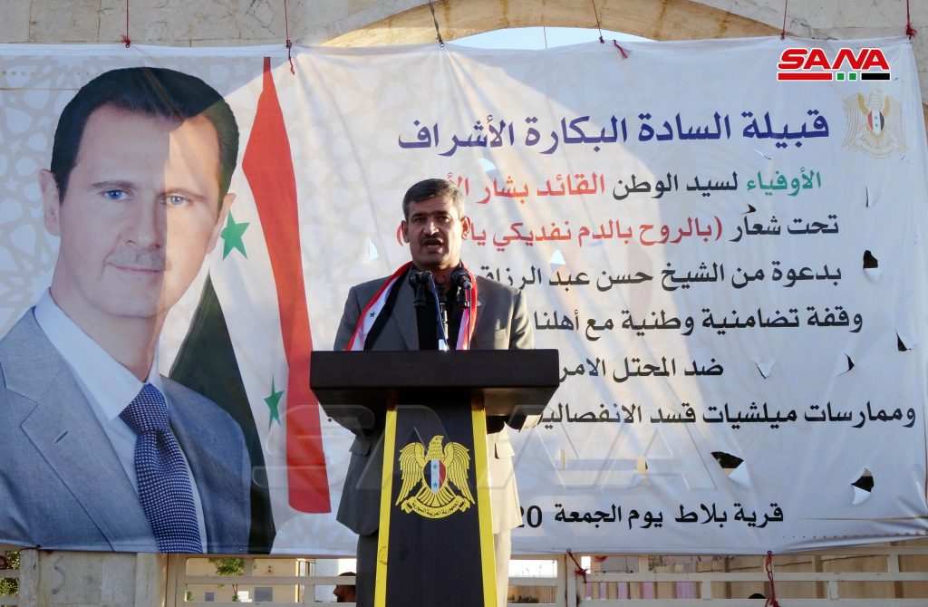 الشيخ حسن عبد الرزاق الحسين أحد وجهاء قبيلة البكارة أكد ضرورة خروج ميليشا قسد والاحتلال التركي والأمريكي من جميع الأراضي السورية وقال “لن نقبل بغير العلم السوري مرفرفاً في سماء سورية”.