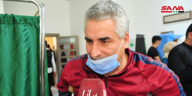 على عكازين وصل أحمد عبد القادر 45 عاماً إلى مركز انتخابي في مشفى القلمون بالنبك في ريف دمشق ليمنح صوته للمرشح الرئاسي الذي سيقود سورية نحو مزيد من الأمان وإعادة الإعمار على حد قوله لـ سانا.