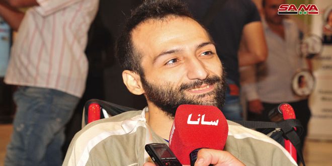 بجسده النحيل وعلى كرسيه المتحرك وبمساعدة والدته يتجول الشاب علي المحمود في المركز الإعلامي لمعرض دمشق الدولي بدورته الـ 61 ملقيا التحية على زملاء المهنة بابتسامة لا تفارق وجهه متابعاً النشاطات التي تتم داخل المركز وخارجه.