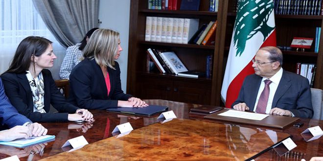 ونقلت الوكالة الوطنية اللبنانية للإعلام عن عون قوله خلال لقائه الممثلة العليا للسياسة الخارجية والأمن في الاتحاد الأوروبي فيديريكا موغيريني إن “لبنان سيواصل العمل لإعادة المهجرين السوريين إلى مناطقهم في سورية” موضحا أن “العائدين يلقون رعاية من الحكومة السورية التي وفرت لهم كل ما يحتاجون من تسهيلات”.