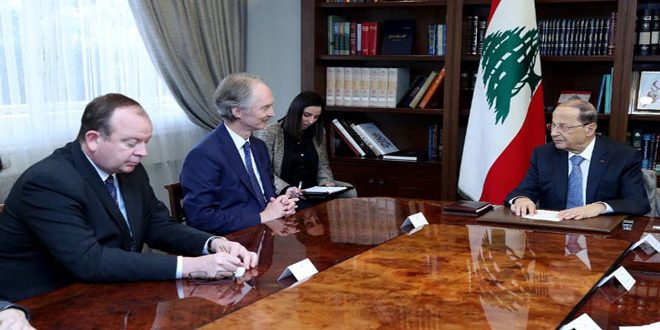 وقال عون خلال لقائه اليوم المبعوث الخاص للأمين العام للأمم المتحدة إلى سورية غير بيدرسون: إنه “لا بد من العمل جديا لإعادة المهجرين إلى المناطق المستقرة في سورية والتي باتت شاسعة ويمكنها أن تستعيد أهلها” مبينا أنه لو خصصت عدة دول شاركت في الحرب على سورية 10 بالمئة من تكاليف هذه الحرب على مساعدة المهجرين لكانت حلت مشاكلهم الإنسانية وجنبت العالم المزيد من الأزمات.