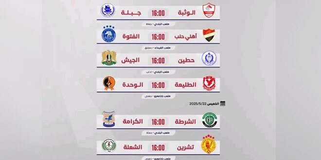 وفي الملعب البلدي بحماة، يواجه الوثبة فريق جبلة، وعلى أرض ملعب الفيحاء بدمشق يواجه أهلي حلب، الطامح إلى استعادة مكانته السابقة في مقدمة لائحة الدوري السوري، فريق الفتوة صاحب اللقب العام الماضي.