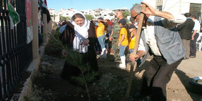 نظمت وحدة الشهيد فداء الحج التطبيقية للمناشط الطليعية بالتعاون مع مجلس مدينة شهبا بالسويداء اليوم فعالية وطنية تضمنت غرس 46 شجرة صنوبر مع لوحات اسمية لشهداء المدينة.