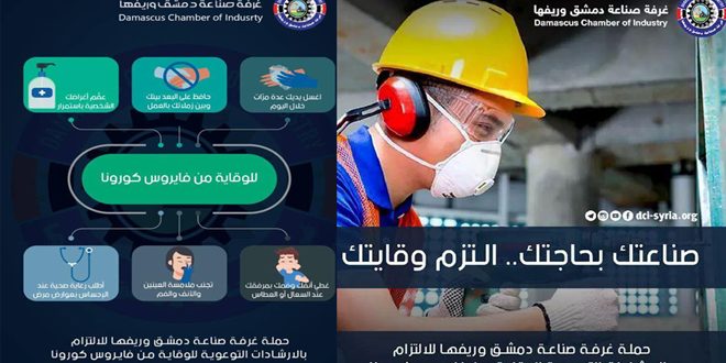 أطلقت غرفة صناعة دمشق وريفها حملة توعوية صناعتك بحاجتك.. التزم وقايتك في إطار الاجراءات الوقائية والاحترازية التي اتخذتها الحكومة لضمان الحفاظ على الصحة العامة وتماشياً مع الجهود والإجراءات المتخذة على المستوى الوطني للتصدي لفيروس كورونا.