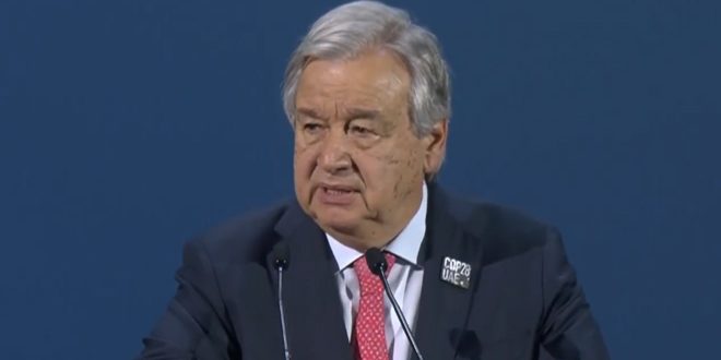 ونقلت رويترز عن غوتيريش قوله في كلمة أمام مؤتمر “كوب 28” المعني بالمناخ والمنعقد حالياً في دبي “لا يمكننا إنقاذ كوكب يحترق بخرطوم من الوقود الأحفوري” مشدداً على أنه “لن نصل إلى حد 1.5 درجة لارتفاع درجات الحرارة إلا إذا توقفنا في نهاية المطاف عن حرق الوقود الأحفوري وليس تقليله أو خفضه”.