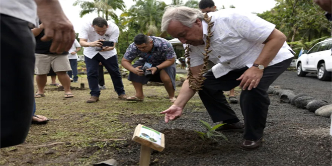 وذكرت وكالة فرانس برس أن غوتيريش نشر خلال “قمة منتدى جزر المحيط الهادئ” في تونغا اليوم بحثاً يفيد بأنّ منسوب مياه البحار في هذه المنطقة ارتفع بوتيرة أسرع من المتوسط العالمي، وقال: “أنا هنا لإطلاق نداء استغاثة عالمي بعنوان أنقذوا بحارنا.. هناك كارثة عالمية تعرّض للخطر جنّة المحيط الهادئ”.