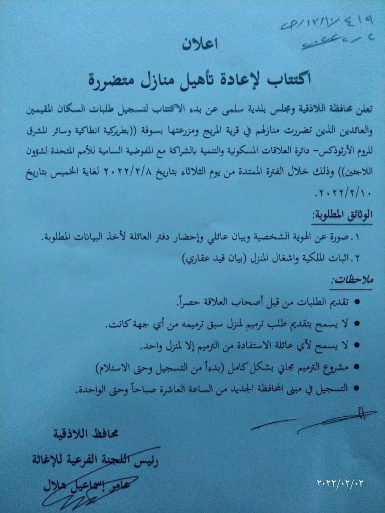 وذكرت المهندسة هالة أحمد مدير مكتب الإغاثة بالمحافظة لمراسل سانا أن طلبات التسجيل شملت المنازل المتضررة في قرية المريج ومزرعتها التابعتين لبلدية سلمى في ريف منطقة الحفة بريف اللاذقية الشمالي مبينة أن التسجيل يبدأ في الفترة الواقعة بين الـ 8 و 10 من شباط الجاري وذلك بمبنى محافظة اللاذقية.