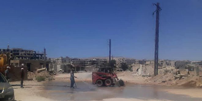 تعمل ورشات مجلسي مدينتي عربين وحرستا بالتعاون مع محافظة ريف دمشق على إزالة وترحيل الركام والأتربة من الطريق العام الواصل بينهما لتسهيل حركة مرور المواطنين والسيارات والتي بدأت منذ اليوم.