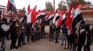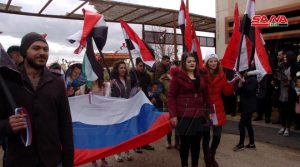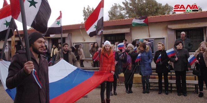 ورفع المشاركون العلمين السوري والروسي ولافتات تتضمن عبارات حول دعمهم الموقف الروسي في العملية العسكرية الخاصة لحماية دونباس واستنكارهم التصعيد الغربي الموجه ضد موسكو مؤكدين الوقوف إلى جانب الشعب الروسي الصديق.