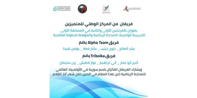 وذكرت هيئة التميز والإبداع في بيان تلقت سانا نسخة منه اليوم: إن الفريقين المتأهلين هما فريق “ألفا تيم” ويضم كلاً من الطلاب (بشر الصالح وجوى حبيب وبشار معلا ويونس شيحا) وفريق “تريبويكا” الذي يضم الطلاب (أمير أبو عمار وأبي ابراهيم ونوار قطيش وزين سليمان).