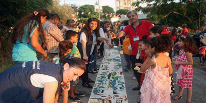 وأشار إلى أن الفعاليات تضمنت مسرح عرائس وألعابا تفاعلية ونشاطات فنية متنوعة ونشاطا لتعليم إعادة تدوير الورق وتقديم هدايا للأطفال واشتراكهم بعمل فني جماعي من وحي مناسبة عيد الجيش العربي السوري التي أقيم المهرجان بذكراه حيث رسم الأطفال ما يخطر في بالهم على لوحة قماشية بطول عشرات الأمتار وستعرض في ساحة المهرجان خلال حفل الختام وتكريم الشهداء والجرحى والمفقودين.