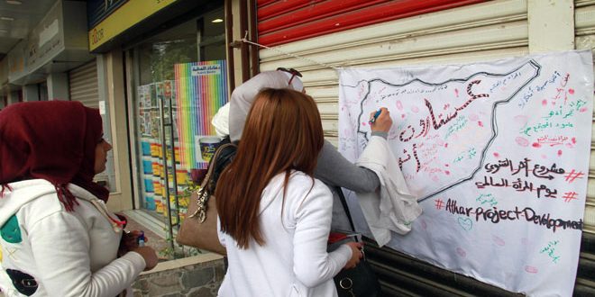 وتضمنت الفعالية ورشة عمل بمشاركة 20 سيدة تحت عنوان “المرأة المتميزة” حول كيفية التعامل مع المرأة واكتشاف مواهبها تلاها توزيع بروشورات توعوية على النساء العابرات في الشارع والتوقيع على لوحة جدارية مرسوم عليها خريطة سورية.
