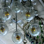 ويعتمد الحلاق في حرفته على مواد أولية بسيطة “الزجاج الكسر والنحاس والحديد” ليقوم بتصميم أشكال متعددة من قطع زجاج مسطحة ومعلق بها قطع زجاجية منفوخة منها الدمعة أو الوردة ويعمل على إدخال عنصري النحاس والحديد عليها.
