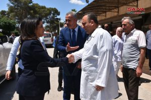بعدها زارت الدكتورة بلخي والوفد المرافق مشفى حماة الوطني للاطلاع على واقع العمل فيها وجهوزيتها وأهم احتياجاتها لما فيه تحسين خدماتها الإسعافية والعلاجية.