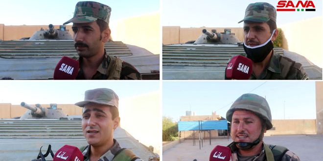 وبمناسبة احتفالات جيشنا في ذكرى حرب تشرين التحريرية زارت كاميرا سانا رجال الجيش العربي السوري في الفرقة الـ 17 بدير الزور والتقت عدداً من أبطالها حيث أكد المقاتل محمد سمير المحمد أن “الانتصار الكبير الذي حققه الجيش العربي السوري في حرب تشرين التحريرية أعاد للمقاتل والشعب العربي بأكمله ثقته بنفسه.. ونحن اليوم نتابع سلسلة هذه الانتصارات وسنبقى كما نحن على الدوام رجال الجيش العربي السوري السياج المنيع والحصن الحصين المدافع عن عزة الوطن وكرامته”.