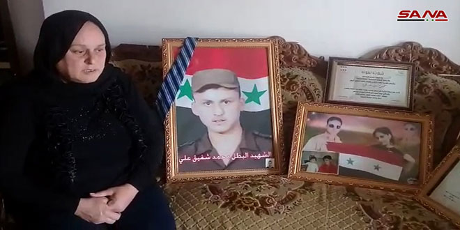من جهتها تقول والدة الشهيد محمد شفيق علي الذي استشهد في زملكا عام 2012 : “دائما أقوى بسماع انتصارات الجيش السوري راضية بقضاء الله وقدره” مضيفة: إن “الجرح في القلب لا يعلمه إلا الله لكن ما يفرحني أنه فارقني شهيدا أرفع رأسي به”.
