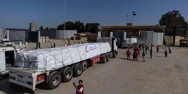 بدأ صباح اليوم دخول أولى الشاحنات التابعة للهلال الأحمر الفلسطيني والأونروا للجانب المصري من معبر رفح لنقل المساعدات إلى قطاع غزة المحاصر الذي يتعرض لعدوان إسرائيلي متواصل منذ 15 يوماً أدى إلى استشهاد 4137 فلسطينياً وجرح أكثر من 13 ألفاً، ونزوح أكثر من مليون فلسطيني، وتدمير البنية التحتية وانهيار المنظومة الصحية.