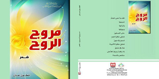 “مروج الروح” مجموعة شعرية صدرت حديثا للشاعر أنطون عازر اعتمد فيها شعر التفعيلة والشطرين بأسلوب عاطفي وفني يشير إلى موهبة قادرة على عطاء الشعر الحقيقي في مواضيع مختلفة بين الوطني والاجتماعي والإنساني.