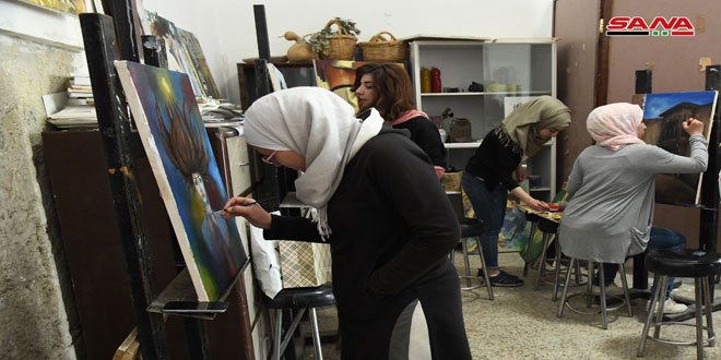 أكثر من 25 لوحة تشكيلية وخزفية جسد من خلالها طلاب معهد الفنون التطبيقية حارات دمشق القديمة وشوارعها وأزقتها وأبوابها ضمن ورشة عمل أقيمت اليوم في قلعة دمشق.