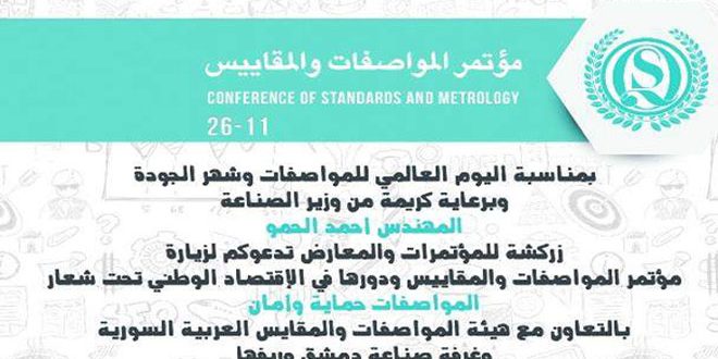 تنطلق يوم الأحد القادم فعاليات مؤتمر المواصفات والمقاييس ودورها في الاقتصاد الوطني الذي تنظمه هيئة المواصفات و المقاييس السورية وغرفة صناعة دمشق وريفها و زركشة للمؤتمرات والمعارض وذلك على مدرج الباسل بكلية الهندسة المدنية في جامعة دمشق تحت شعار “المواصفات حماية وأمان”.