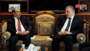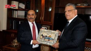 بحث وزير الزراعة والإصلاح الزراعي المهندس محمد حسان قطنا مع وزير الزراعة الفلسطيني رياض عطاري والوفد المرافق اليوم مجالات التعاون في القطاع الزراعي ودعم الجانب البحثي وتبادل الخبرات.